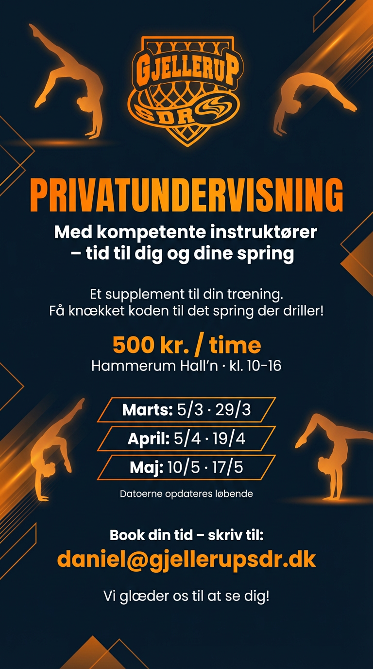 Så hvis du har en araber-flik, der driller eller en dobbeltsalto, der bare ikke vil lande på benene, så book en tid til privatundervisning ved at skrive en mail til: daniel@gjellerupsdr.dk.